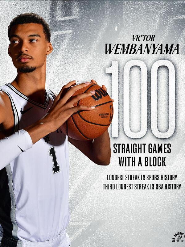 文班亚马连续100场比赛送出封盖 创造马刺队史纪录